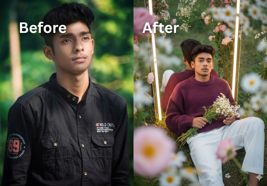 Both of these artistic directions highlight how AI-driven imagery can transform ordinary references into extraordinary visual narratives. Whether you want the polished, cinematic mirror look or the romantic floral editorial vibe, these portraits combine hyper-realistic detail, emotional depth, and high fashion sensibility.