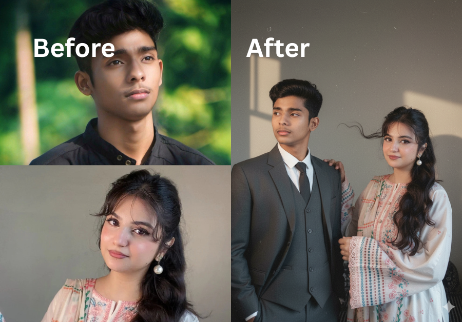 The man wears a sharp three-piece suit, offering a striking contrast with his companion’s traditional attire. While she gazes toward the lens, his sideways glance adds a sense of mystery, drama, and storytelling—like a scene cut straight from a classic South Asian movie.