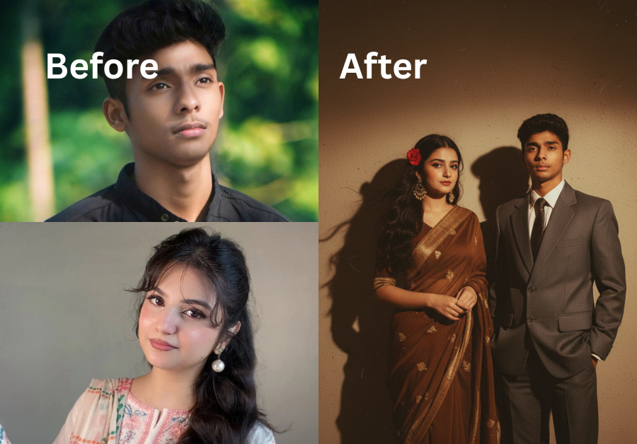One of the most captivating ideas is the 90s retro couple portrait β blending a baddie-inspired saree look with a matching vintage suit, all wrapped in warm film tones and cinematic shadows. This combination not only celebrates old-school romance but also elevates it into a piece of artistic editorial photography.