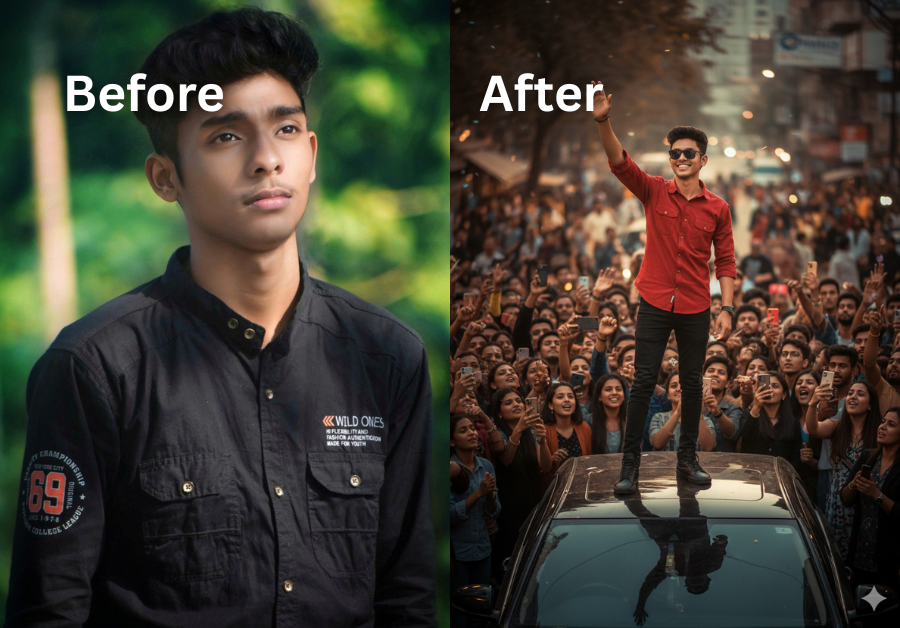 One striking example of this creative style is an ultra-realistic cinematic photo of a young man confidently standing on top of a car in the middle of a huge crowd. The energy of the scene is magnetic—vivid colors, dynamic angles, and raw emotions all come together in a way that instantly grabs attention.