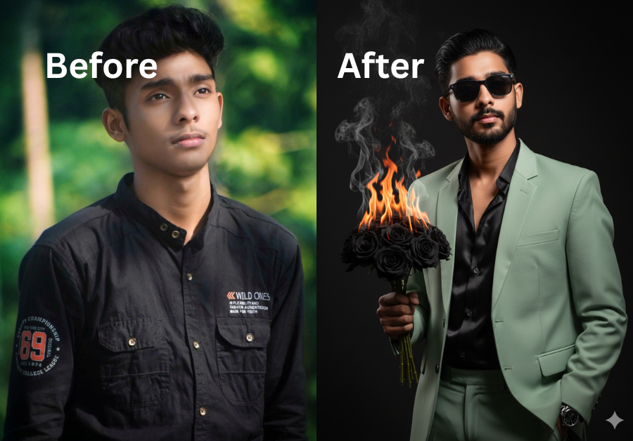 One such trending concept is the creation of a modern, confident male portrait enhanced with dramatic styling and surreal floral elements. The combination of high-fashion clothing, artistic lighting, and symbolic props like burning roses makes this type of AI artwork not just an image—but a powerful visual story.