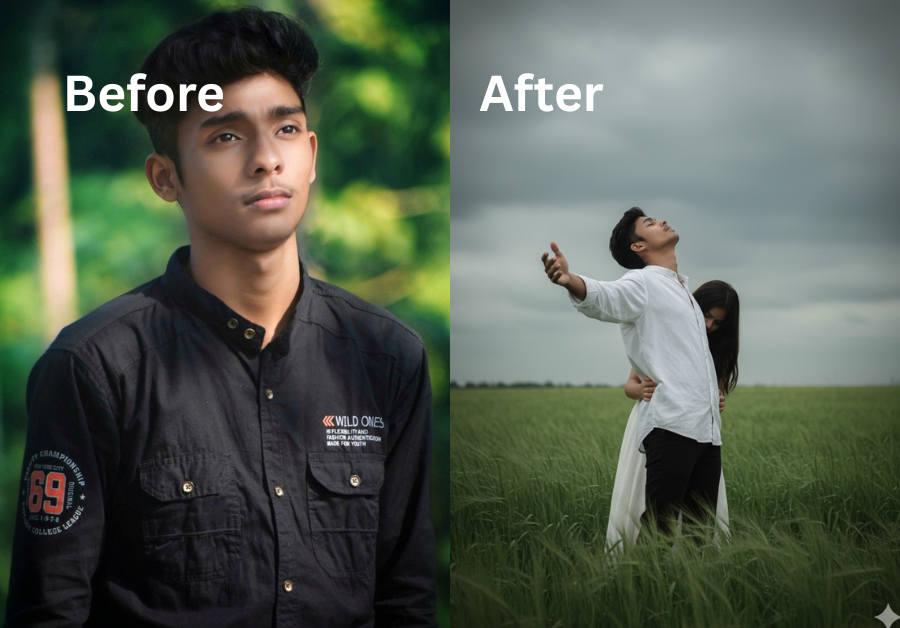 To add depth, the AI also generates a girl standing behind you, gently embracing you — giving the picture a cinematic romantic vibe.