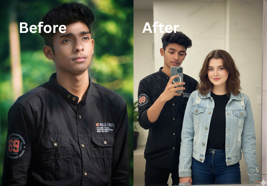 - After – The same selfie, but now with a beautiful girl standing beside you, styled casually in a natural way, as if it were a real candid shot.