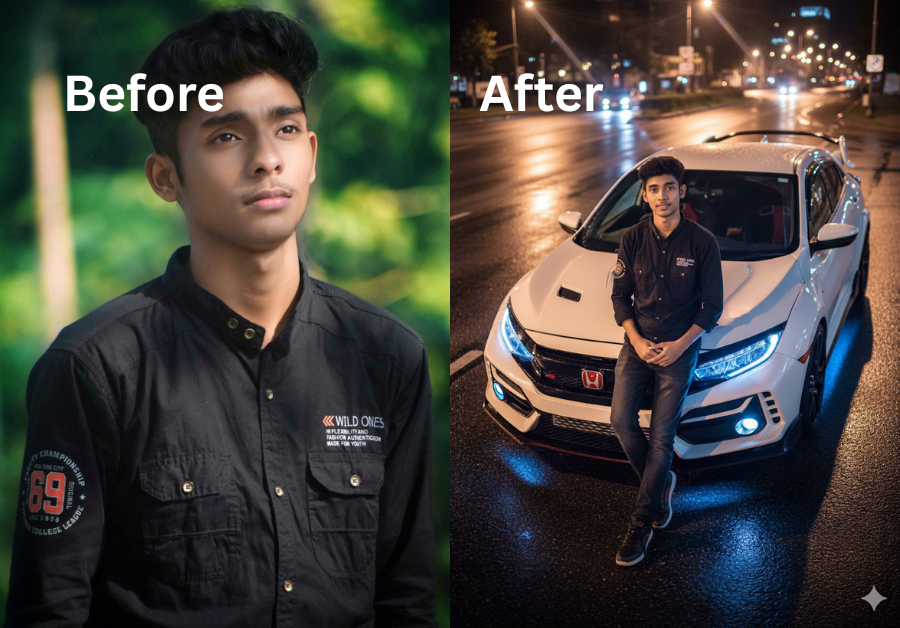 The image above shows a young man leaning on a Honda Civic Type R at night under streetlights. The glowing neon lights, cinematic tones, and high-angle shot make it look like a DSLR photo taken with professional gear. This is the power of AI car photography.
