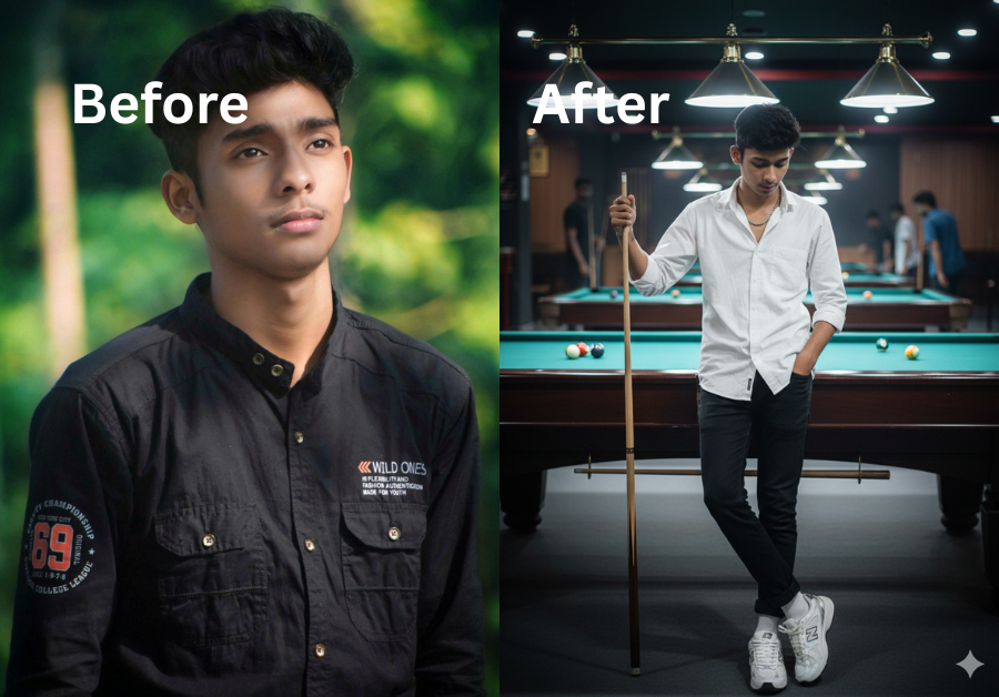 The environment is set in a bright billiard hall, with several pool tables lined up in the background. Hanging lights create a glowing, cinematic mood over the tables, while a few other people can be seen playing in the distance. This setting enhances the urban, chill, and sporty vibe of the image, making it feel like a real weekend hangout scene.
